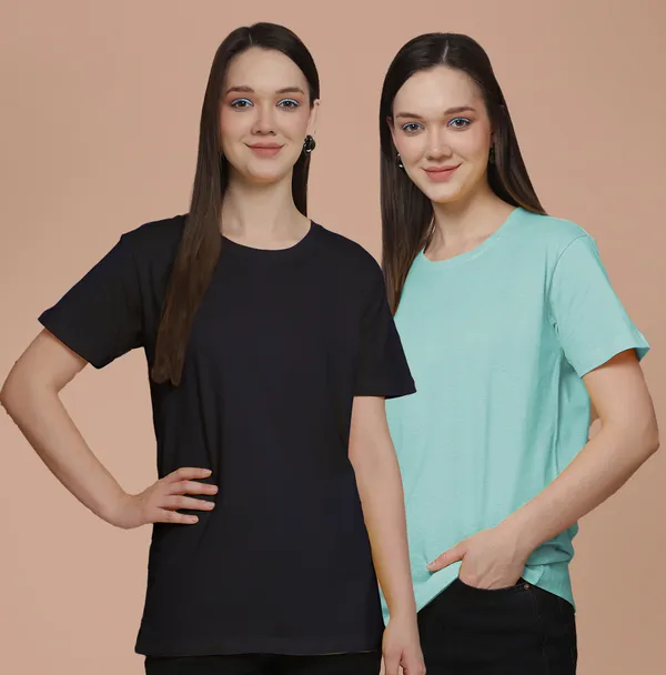 Women Navy Blue & Light Turquoise Round Neck Oversized Tshirt